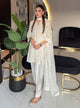This ensemble features a long kurta with a round neckline, adorned with button detailing. Complimented by fitted sleeves and straight trousers, paired with an organza dupatta comprising of silk patti finishing on the border.