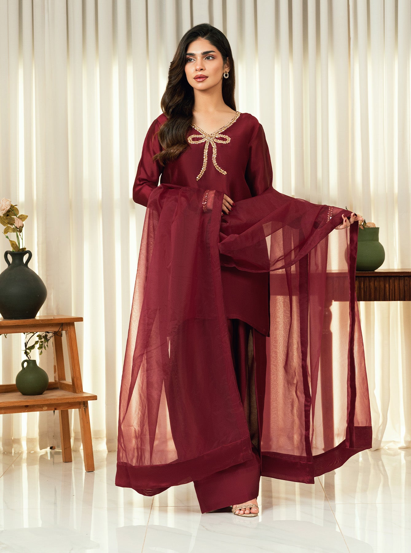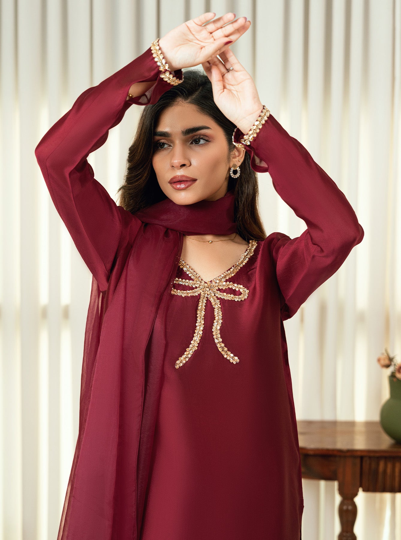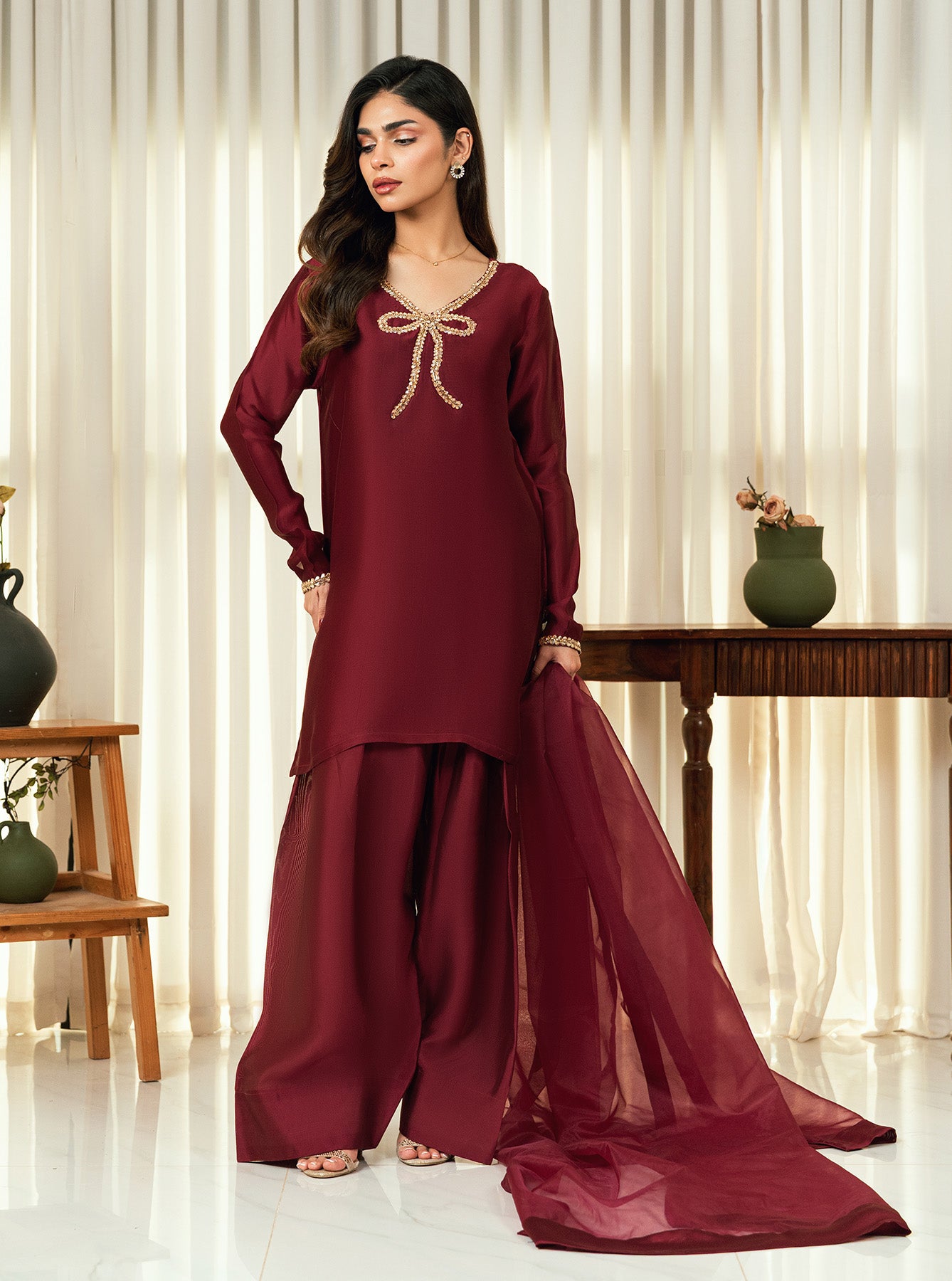 Embrace timeless elegance with this bestseller outfit crafted in luxurious pure sheesha silk that flows effortlessly with every step. The outfit features a beautifully tailored Farshi shalwar, adding a regal, structured charm to the silhouette. Paired with a lightweight organza dupatta, delicately finished to complement the entire look - this ensemble is a blend of modern grace and traditional allure.
