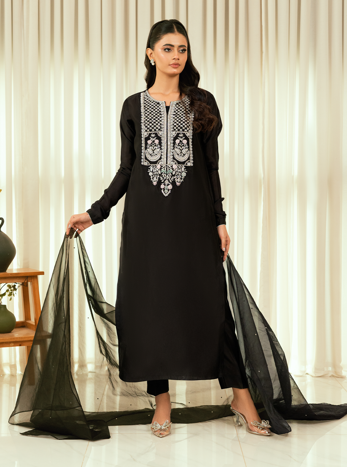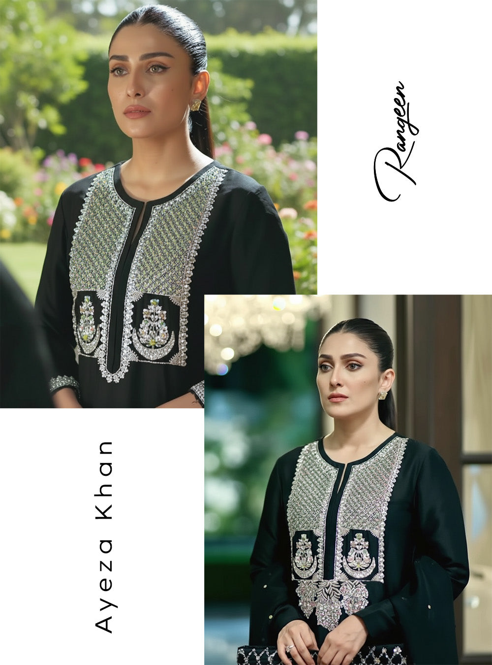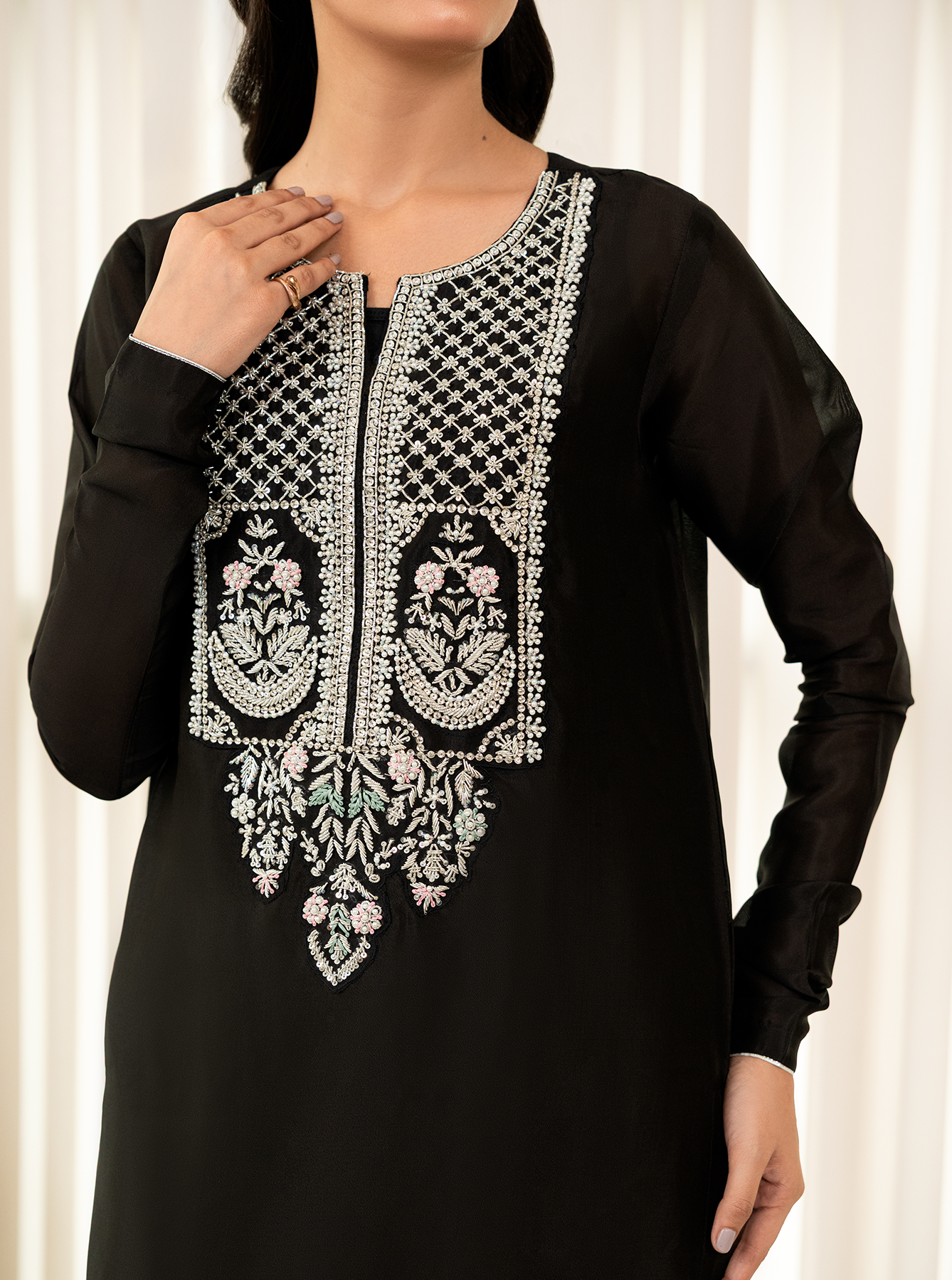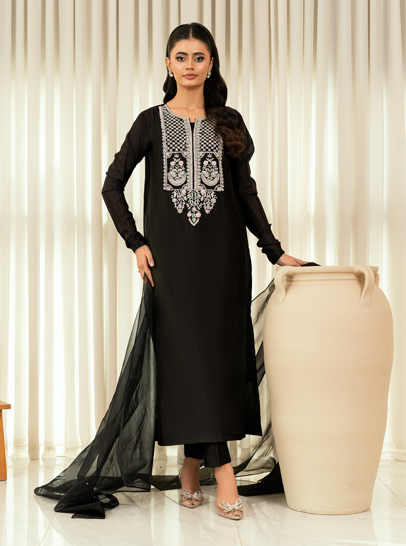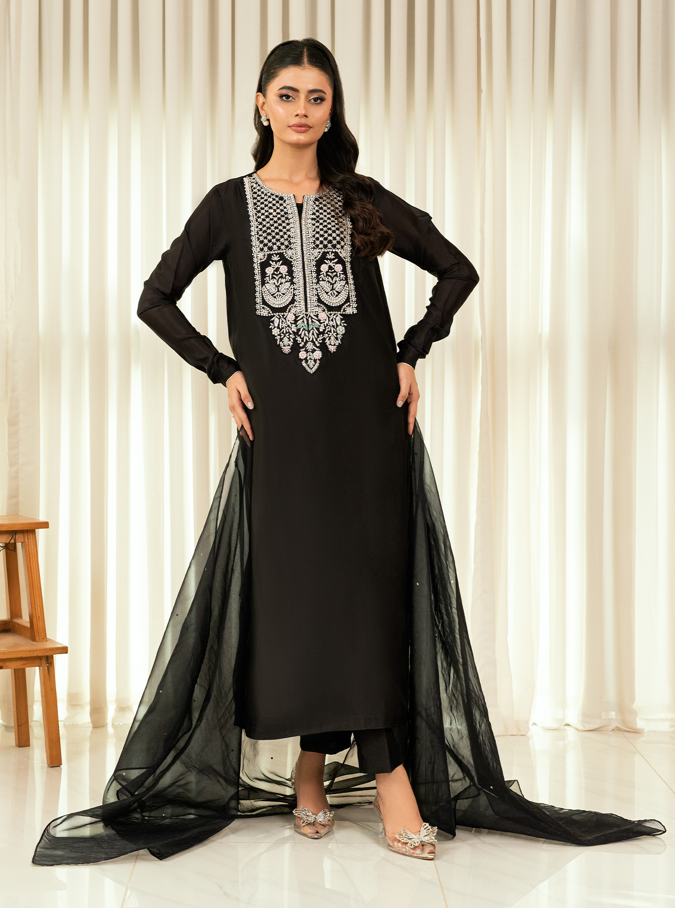 Turn every celebration into a statement. This 3 piece beautiful dress is meticulously hand-embellished with an intricate jaal featuring naqshi, mukesh, and pipe-bead work that glimmers beautifully under festive lights. Finished with a tailored trouser and a sheer organza dupatta, it’s an elegant choice for mehndi, dholki, and grand shaadi events.