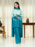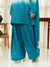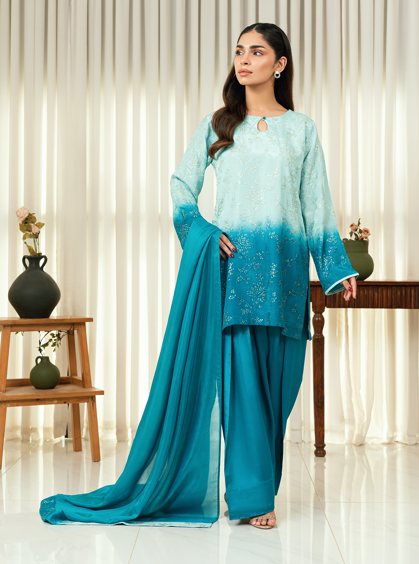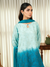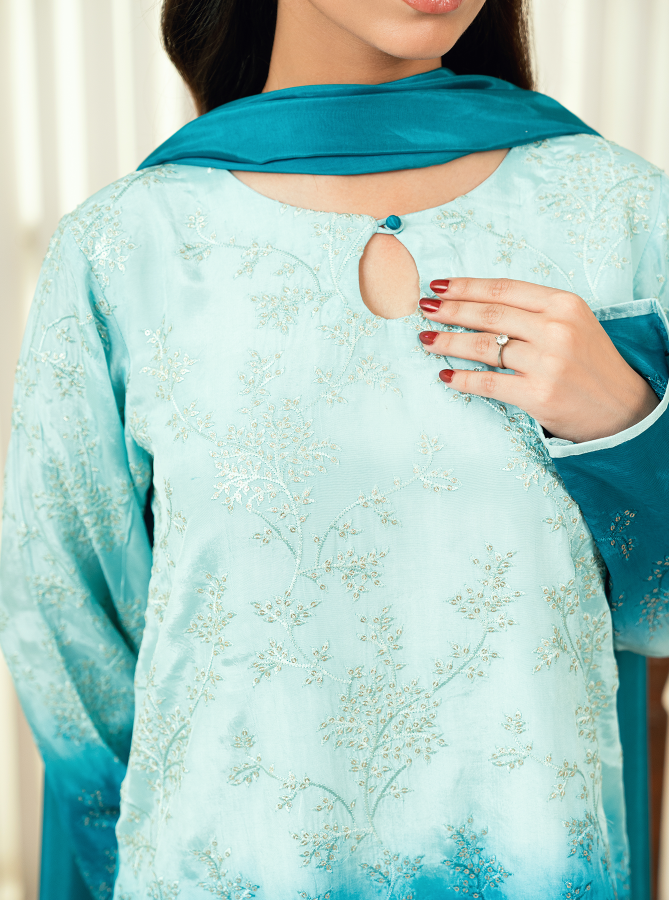 This exquisite turquoise tye dye ensemble showcases a luxurious embroidered russian silk shirt, radiating elegance and sophistication. It is paired with a finely tailored raw silk trouser and medium silk dupatta, adding structure and grace to the look.