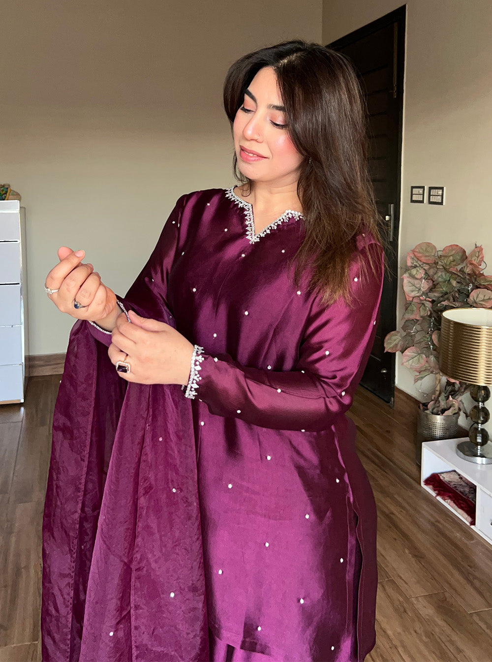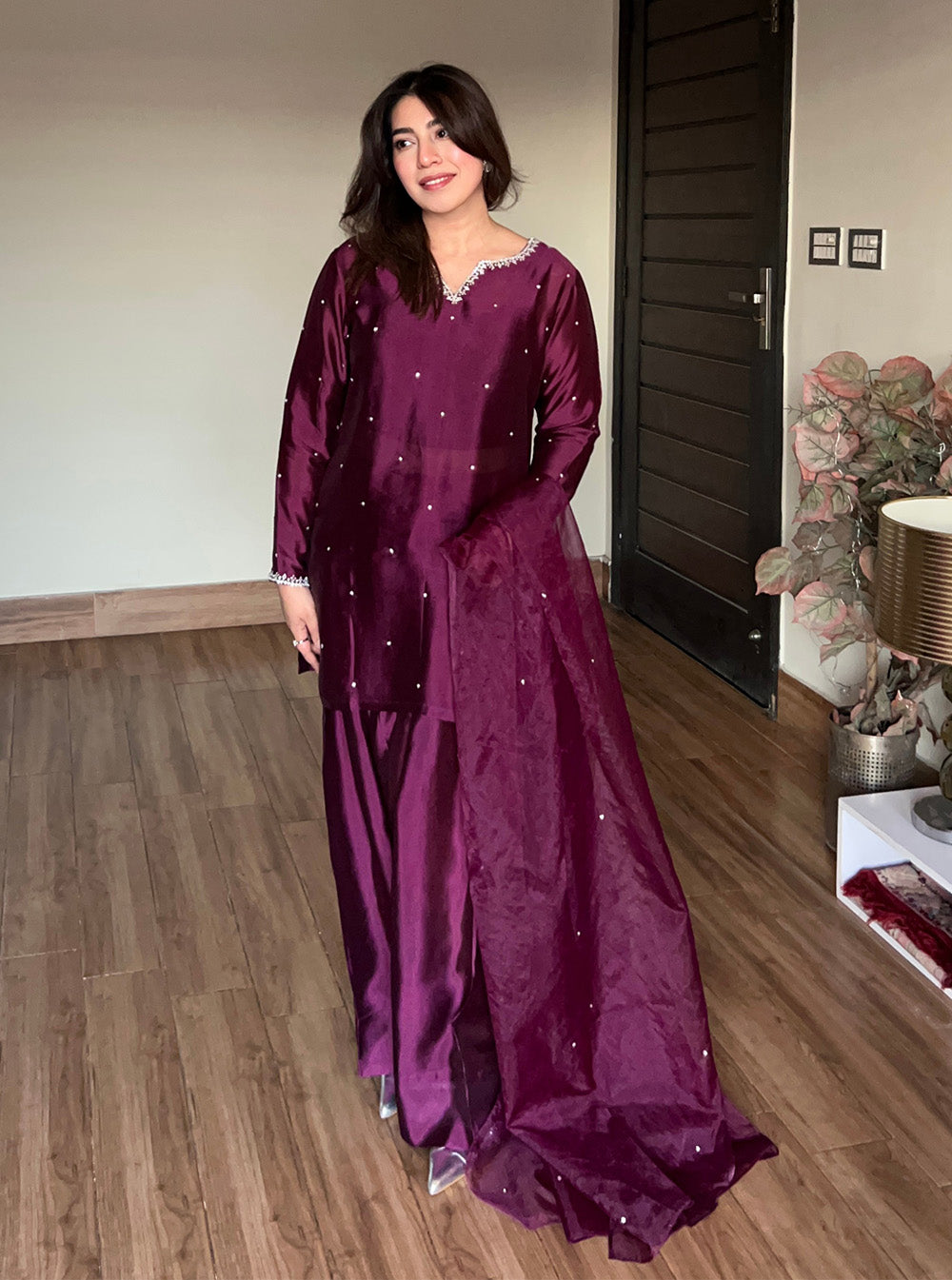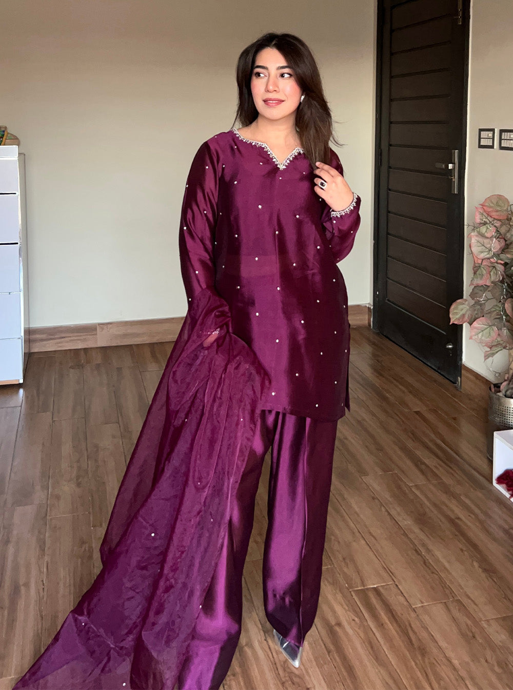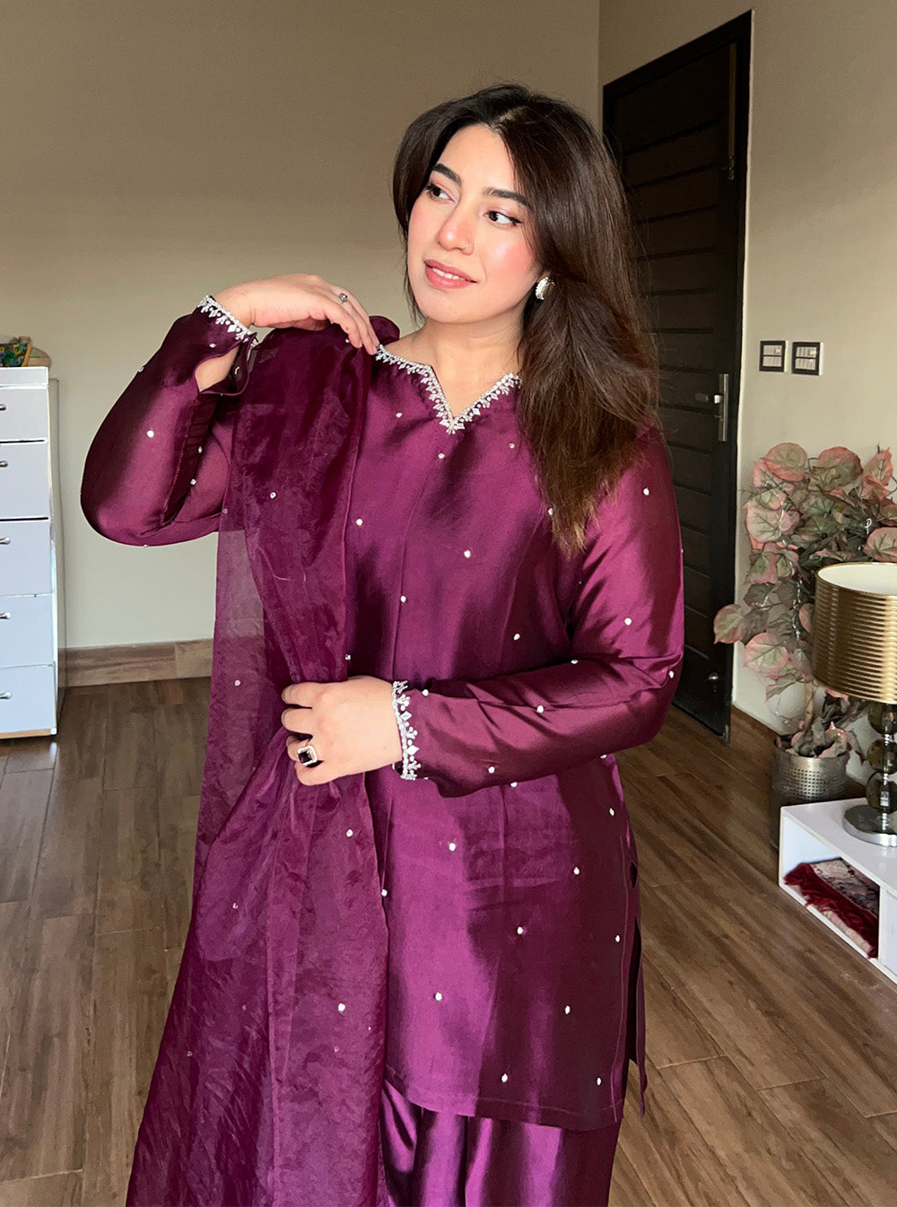 Completing the ensemble is a delicate organza dupatta, adorned with subtle stone embellishments that catch the light with every movement. Light, airy, and beautifully finished, it adds a soft shimmer that enhances the overall outfit without overpowering it.