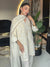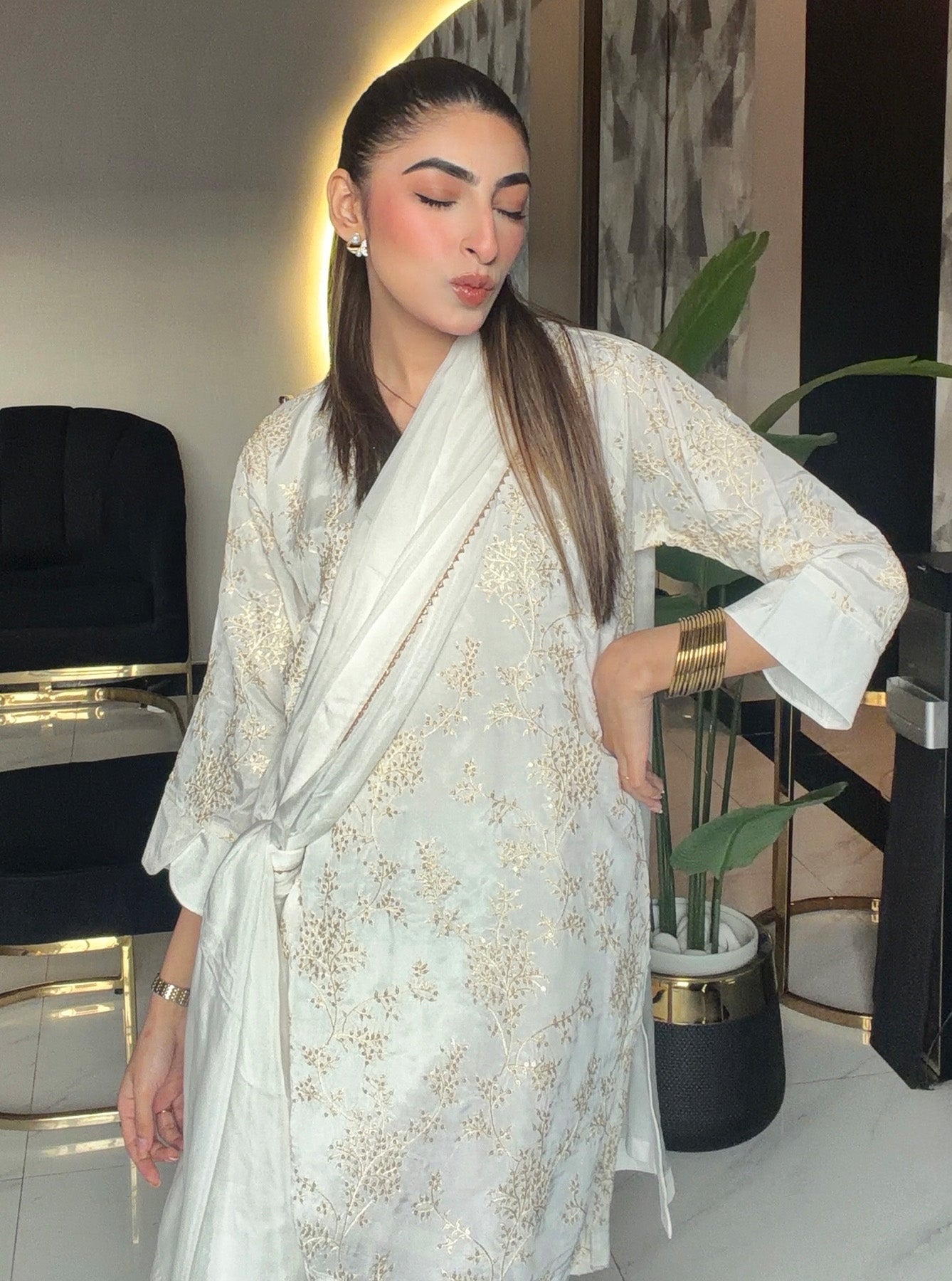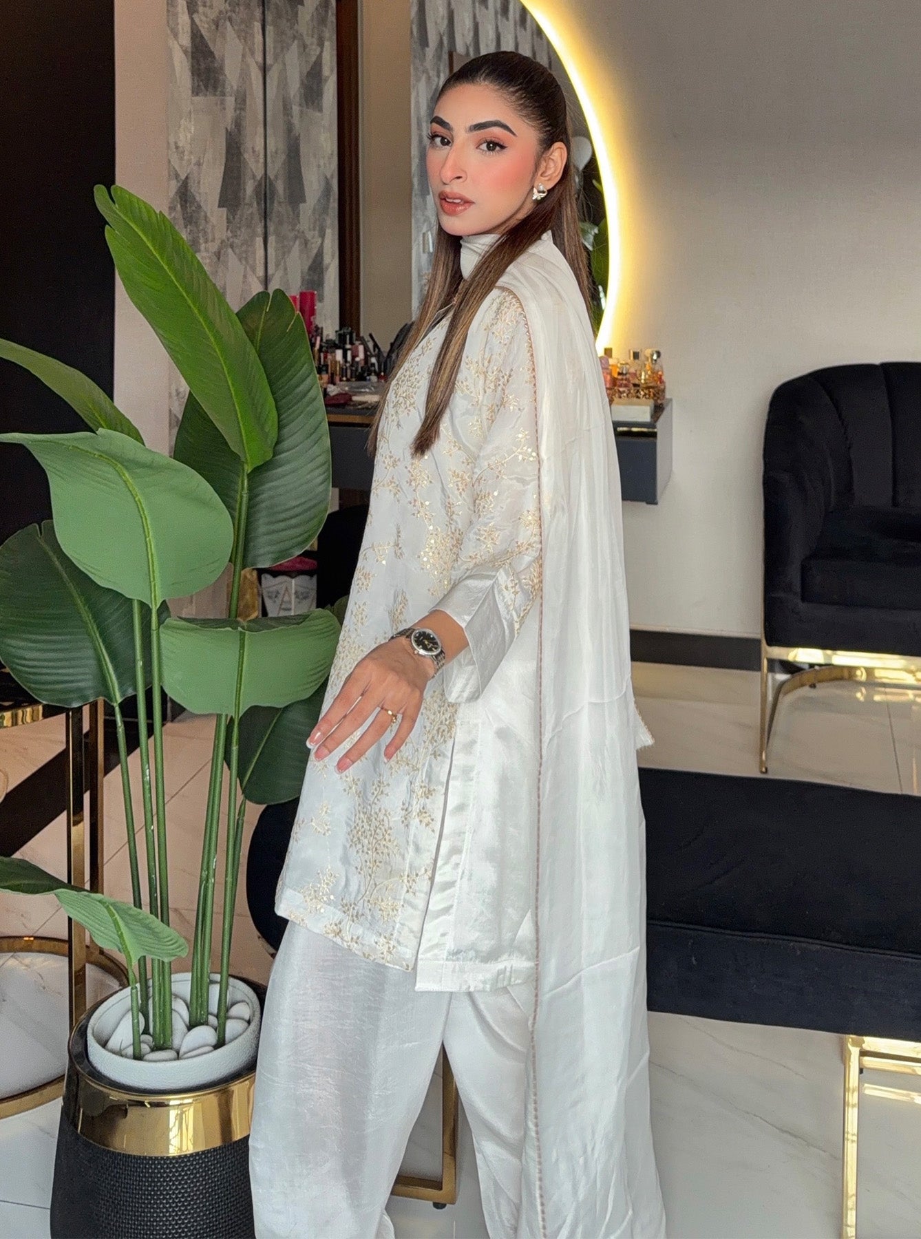 This outfit is a beautifully tailored white Russian silk shalwar kameez that reflects elegance and sophistication. The kameez is crafted from smooth, slightly glossy Russian silk and adorned with delicate gold floral embroidery spread evenly across the front and sleeves, giving it a refined festive appeal. It features a straight, relaxed silhouette with three-quarter sleeves and a modest neckline, creating a graceful and polished look.