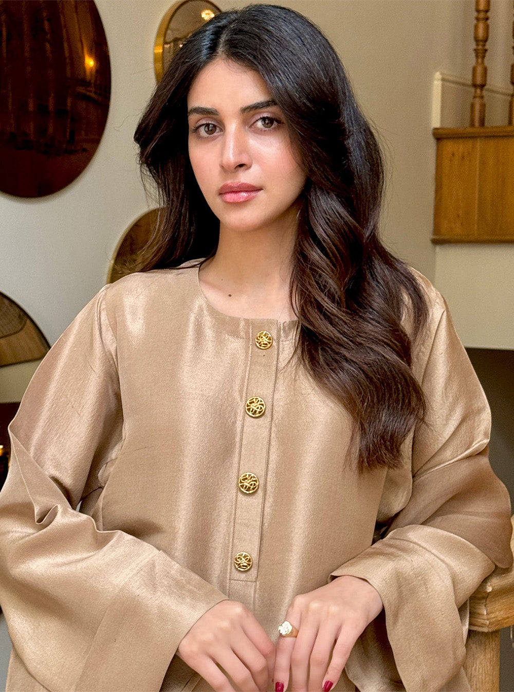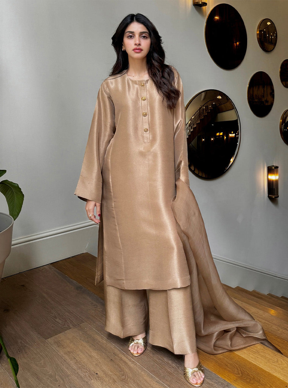 Graceful in its simplicity, this beige three-piece set is tailored from pure Sheesha silk for a polished, luxurious feel. The long shirt is designed with a straight cut and dual-panel detailing, complemented by full-length sleeves and a front placket finished with elegant gold-toned buttons. Coordinated wide-leg trousers enhance the streamlined silhouette, while a sheer organza dupatta with delicate stud accents adds a hint of understated sparkle. A perfect choice for those who appreciate minimalist sophistication with refined detailing.